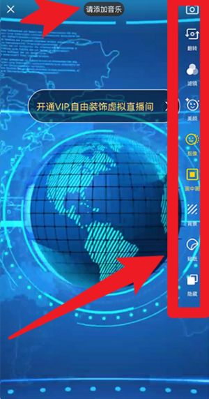 4、在虚拟直播间内,右侧功能栏支持滤镜、美颜、道具、背景替换、贴纸和特效添加等操作,上方还能添加背景音乐增强氛围。