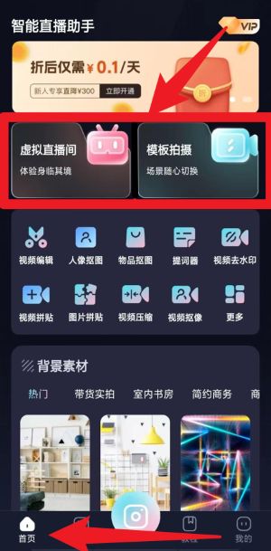1、在首页界面点击虚拟直播间或模板拍摄,即可进入不同的直播或拍摄模式,支持虚拟环境体验与多场景切换。