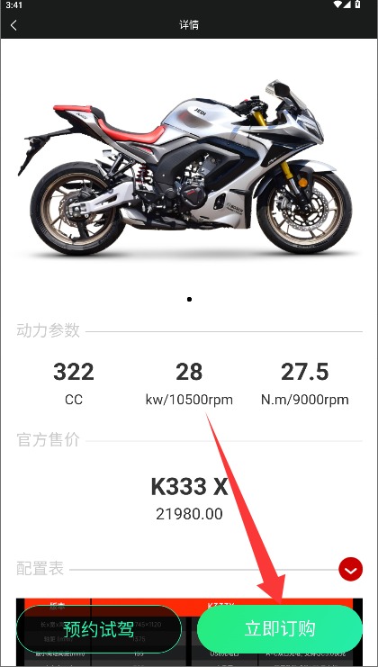 4、进入摩托车详情界面查看详细信息,点击页面右下角立即订购按钮付款完成订购。