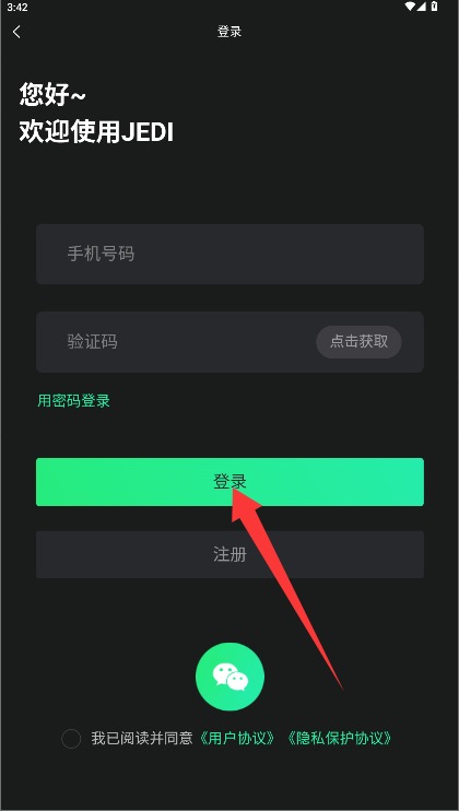 2、在登录页面输入账号和短信验证码,勾选同意相关条款后点击登录进入应用。