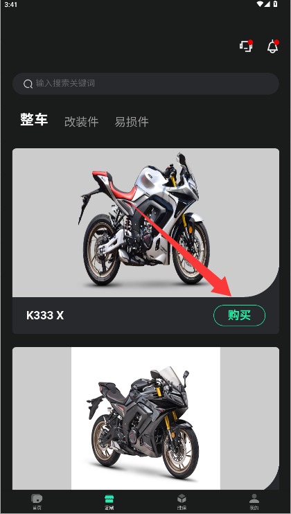 3、在定制界面浏览摩托车遇到心仪的点击购买进入查看,或搜索栏输入关键词查找。