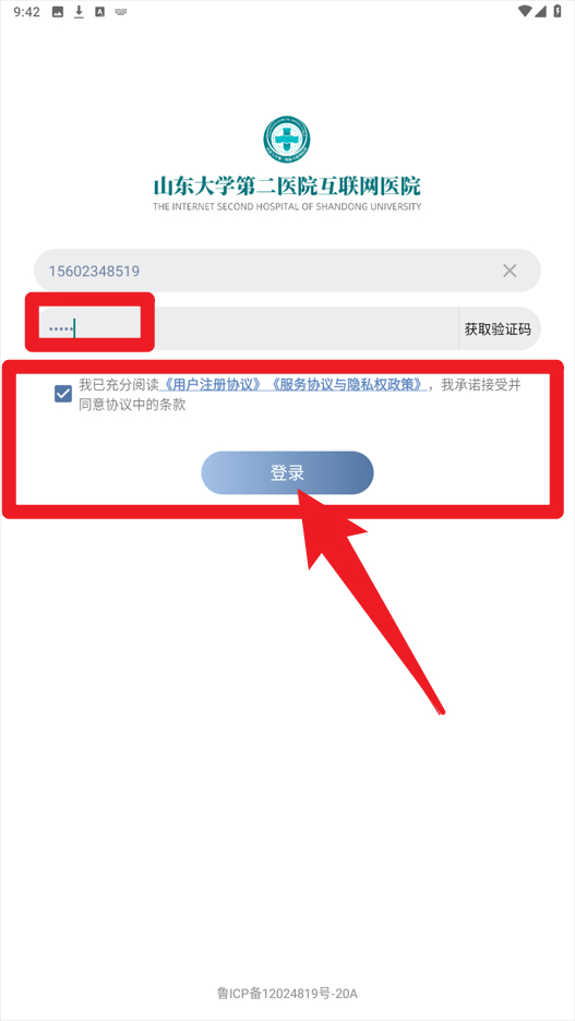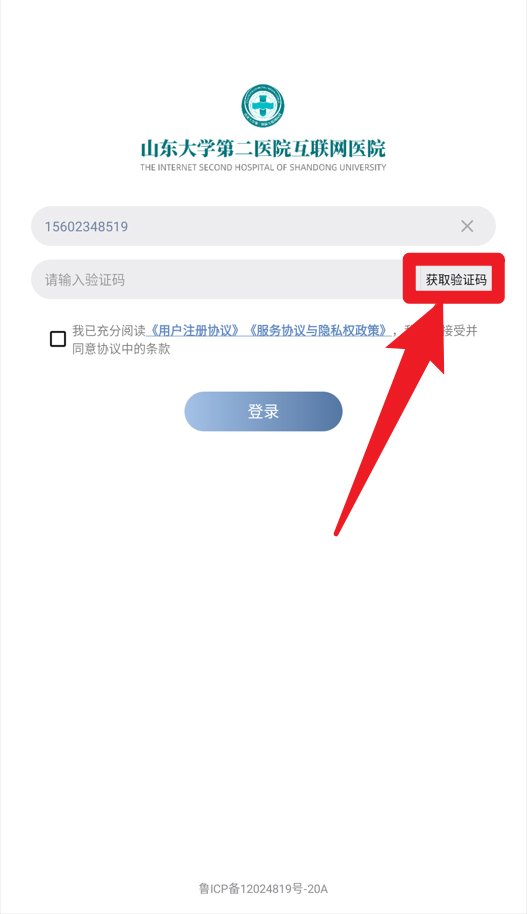 3、在验证码输入框中正确填写收到的验证码,同时勾选用户协议与隐私条款后,再点击登录按钮进入系统。