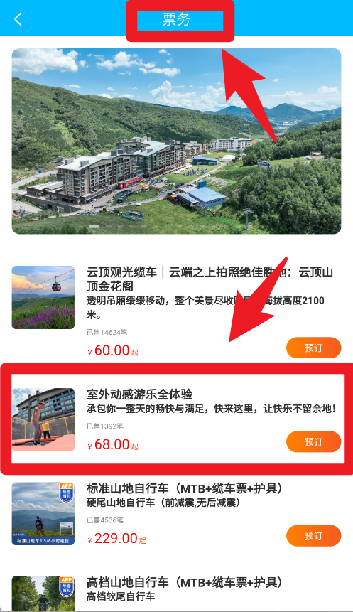 3、在票务板块,用户能浏览观光缆车、户外项目等多种门票,清晰展示价格与介绍,点击即可快速下单。