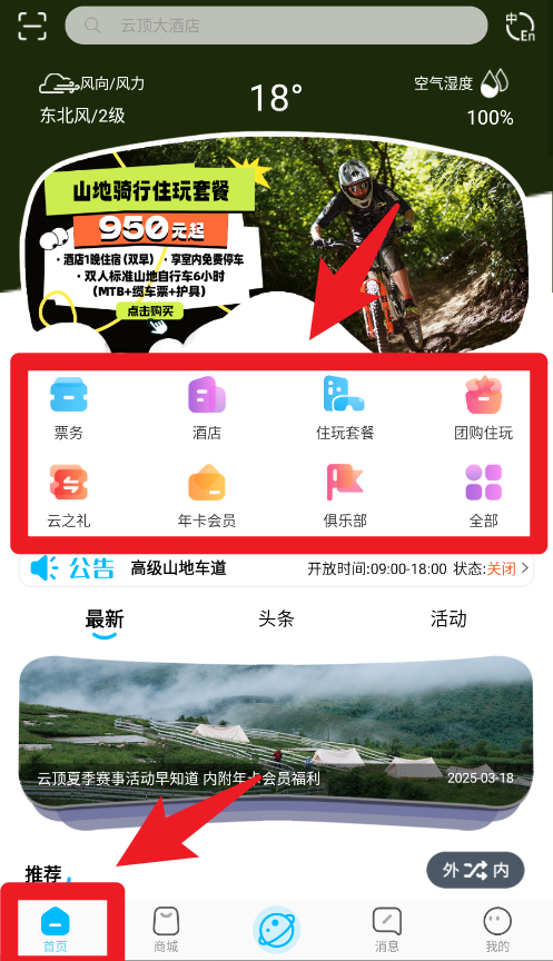 2、首页汇集票务、酒店、住玩套餐等服务,用户可一键预订所需项目,滑雪出行、住宿娱乐安排便捷高效。