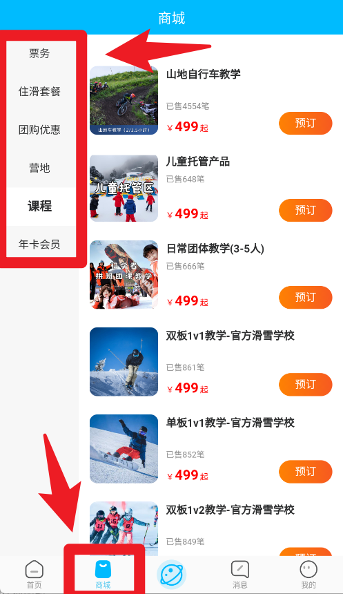 4、商城中涵盖票务、套餐、课程、会员等分类,用户能直接选择心仪的产品,轻松完成预订与支付。