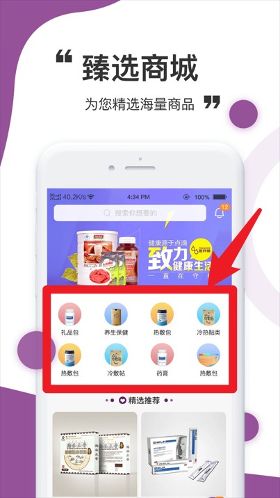 3、臻选商城汇聚多类健康商品,用户可按分类快速查找并选购所需产品。