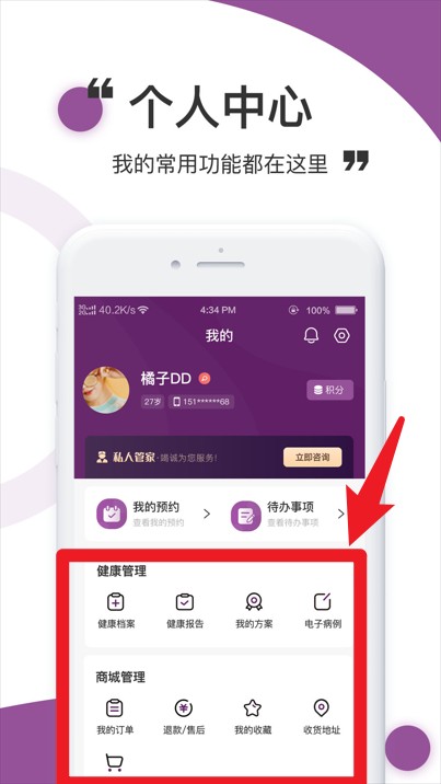 4、个人中心汇总健康管理与商城订单等功能模块,便于统一查看和操作。