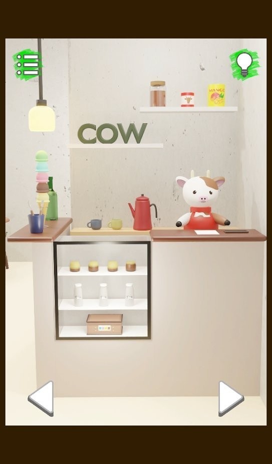 找到逃离这座咖啡馆的线索,你来这里参观,但是淘气的牛牛捉弄了你。