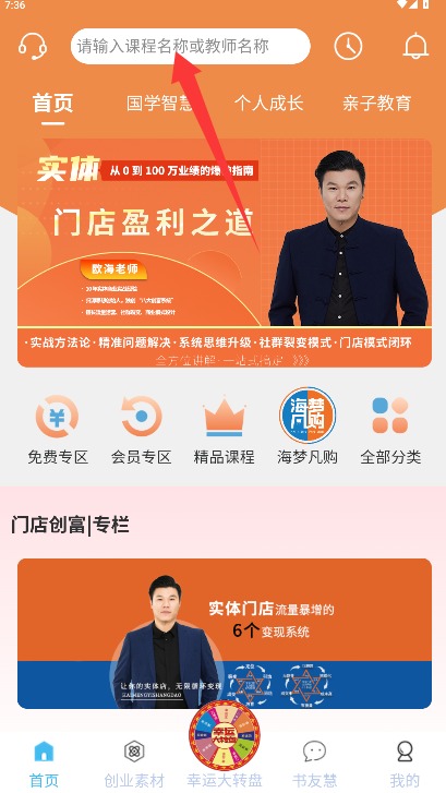 3、在首页搜索栏中输入课程关键词或讲师姓名信息,快速查找目标教学课程内容。