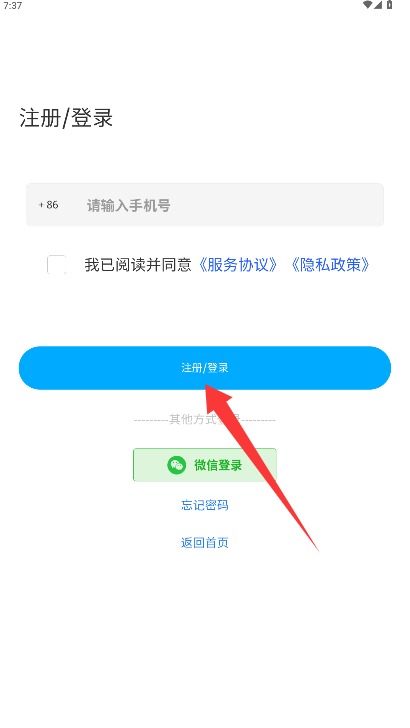 2、输入手机号,勾选同意协议后点击注册、登录按钮,输入验证码后完成注册登录。