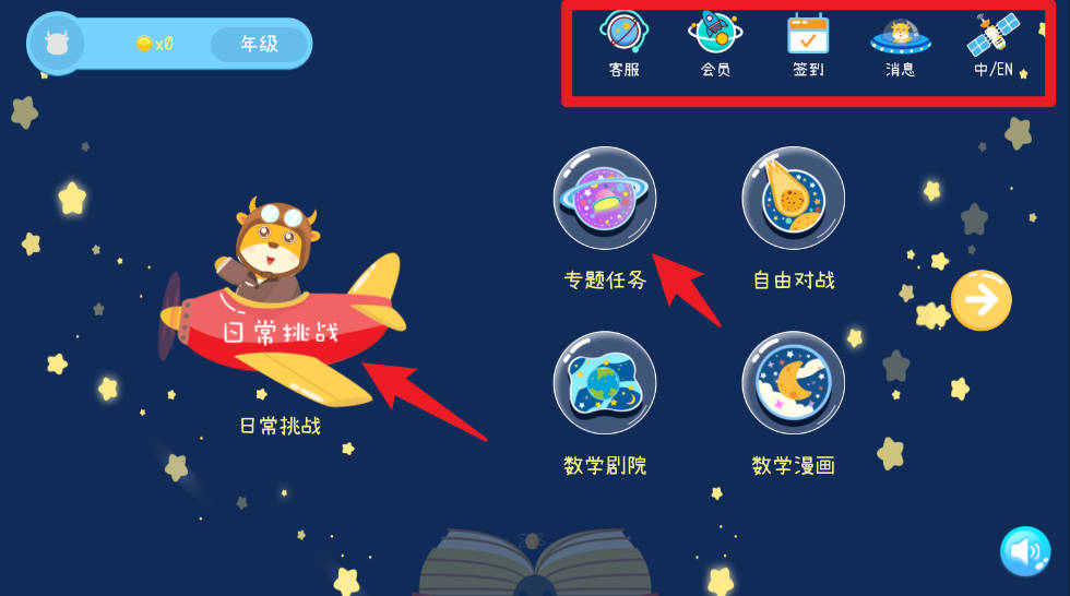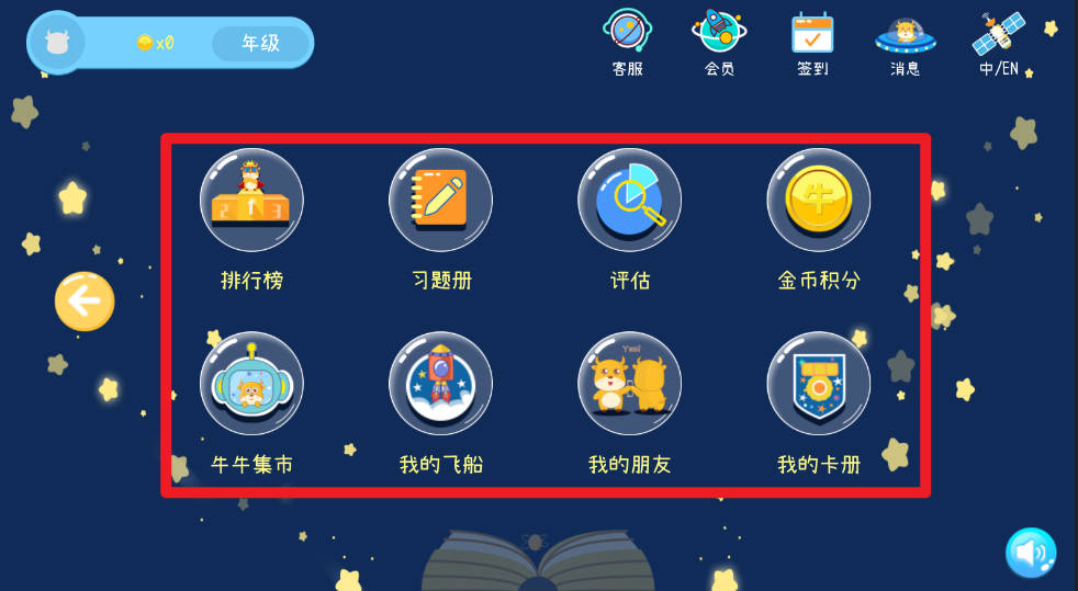 3、首页还有包含排行榜、习题册、评估、金币积分、牛牛集市、我的飞船、我的朋友以及我的卡册等多种模块。