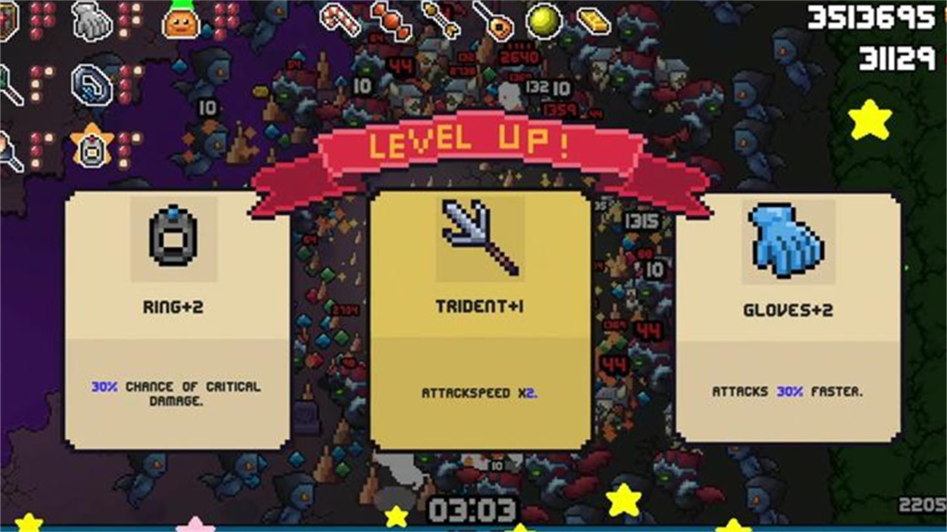 3. 极致割草体验:武器系统支持自由搭配与升级,玩家可通过叠加攻击速度、范围伤害等属性,打造“一秒清屏”的极致爽感。例如,弓箭穿透+炸弹袋的组合可实现远程群体杀伤,而火焰护盾+生命偷取则能兼顾生存与输出。