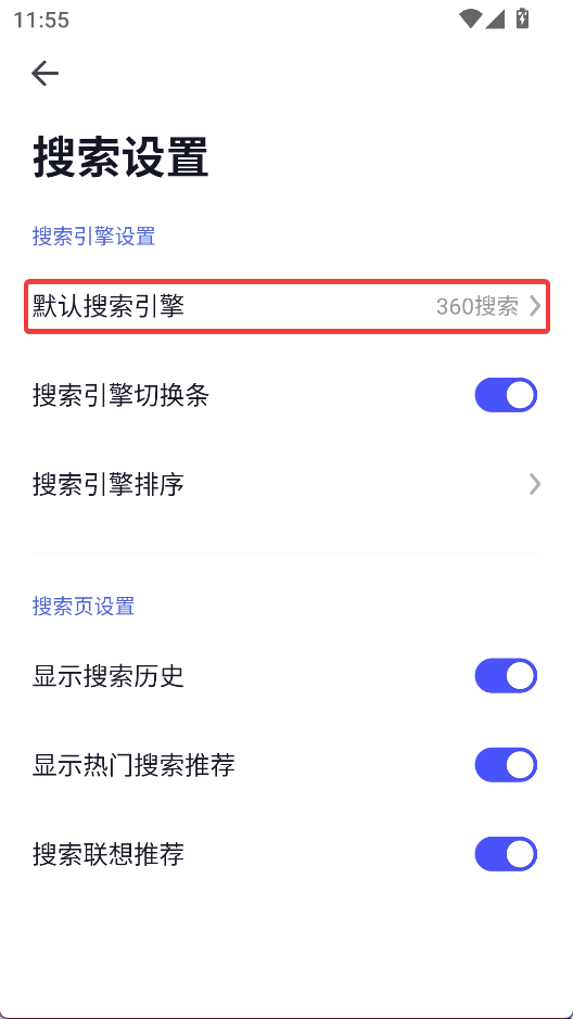 3、进入搜索设置中,点击默认搜索引擎进行切换