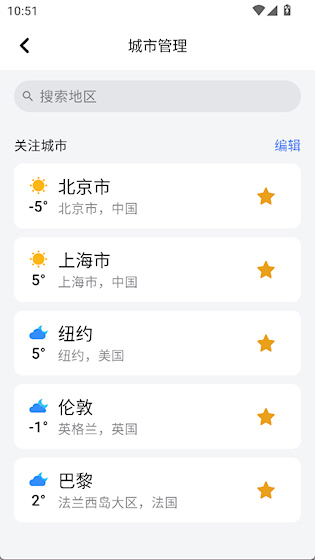 可自由添加、删除、排序多个关注城市,方便经常出差或关心异地亲友天气状况的人群快速切换查看。