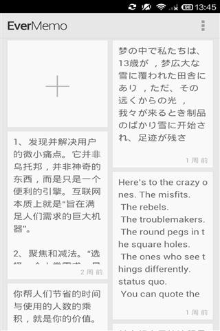 Evermemo内置启动进入编辑模式,让你启动之后迅速进入编辑模式,不再让你的灵感溜走· 你可以把你的Memo分享到微博,Facebook和Twitter,当然你还可以分享到Evermemo内置的匿名社区“Mocha”· 你还可以在Memo中设置提醒,这样就会在你的