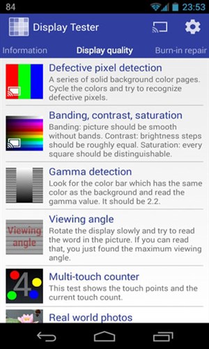 软件。屏幕测App测试功能有很多,像点对点测试,屏幕色彩测试以及图表测试、死点测试等等,功能挺丰富的。
