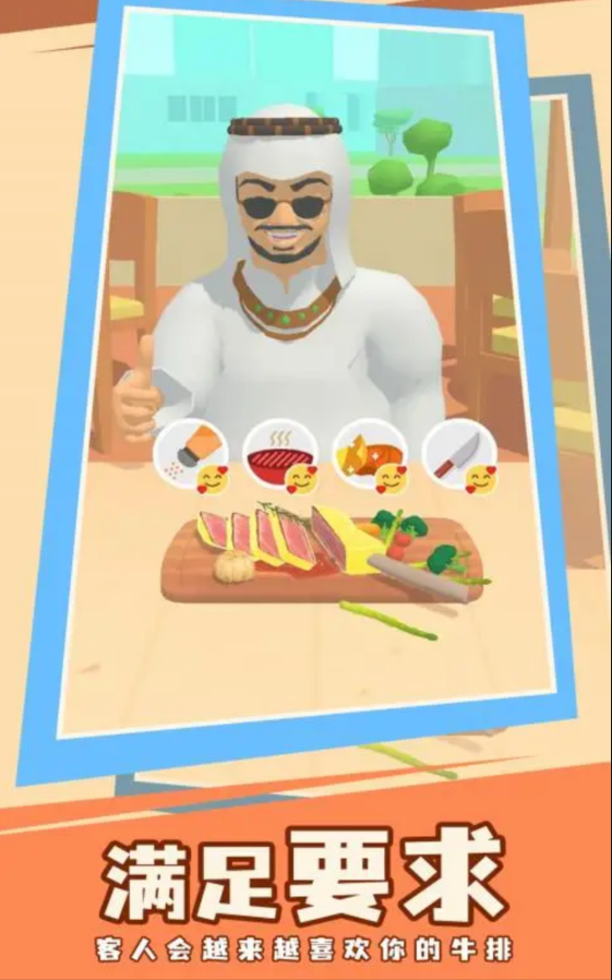 1、放置经营类型游戏,牛排制作过程需要掌握好火候,不论任何时候出品牛排。