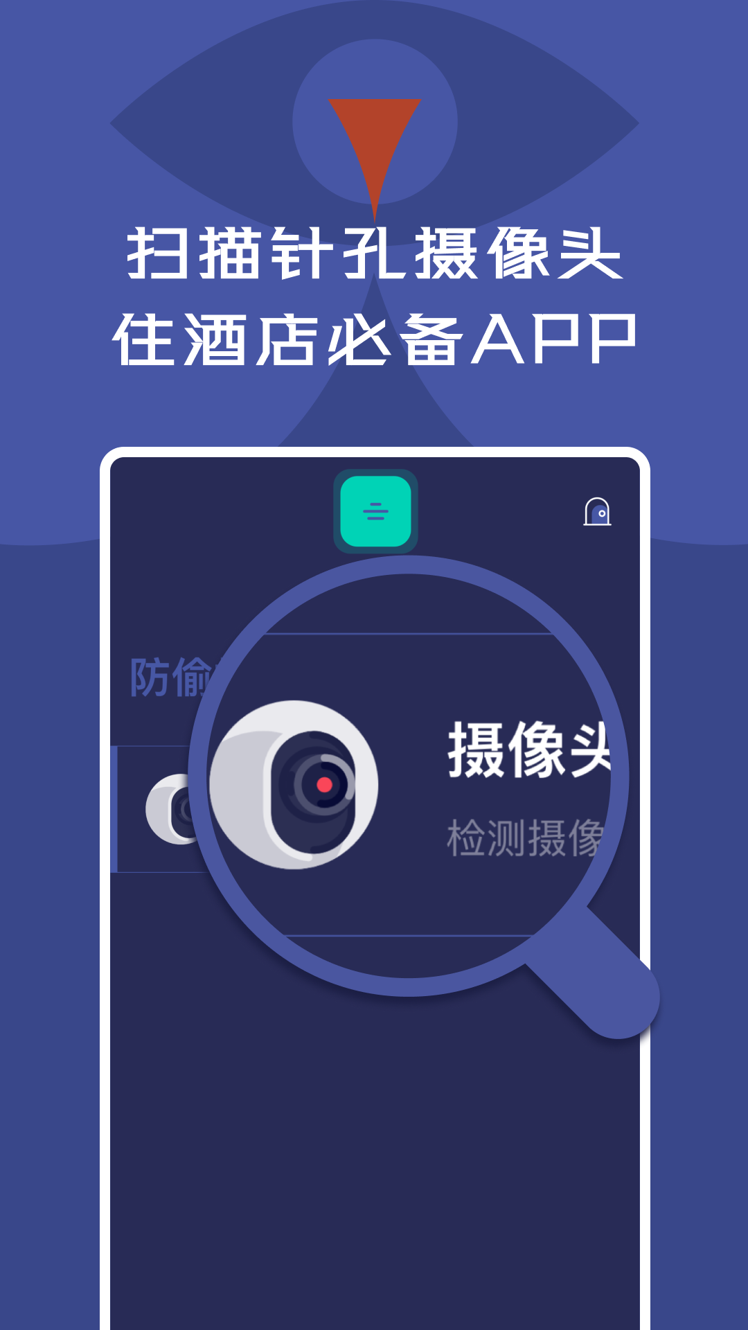 去酒店最怕遇到什么?隐藏在暗处偷偷拍摄记录的针孔摄像头!该如何检测酒店房间有无针孔摄像头呢?快点使用酒店民宿守卫者app吧,它是针孔摄像头的天敌,可以检测房间或者小型公共场所比如卫生间内,是否装有针孔摄像头,一旦软件检测出有不明设备,会立即发出警报提醒使用者。