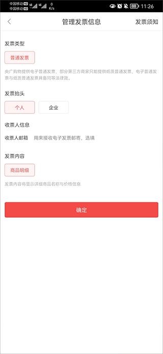 3、选择个人或企业抬头,企业发票需填写单位名称、纳税人识别号,完善收票信息后点击【确定】。
