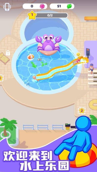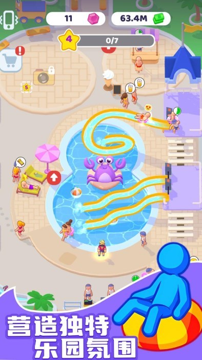 1. 高自由度建造:提供26种建筑类型,涵盖螺旋滑梯、冲浪池、养生温泉等,玩家可自由调整设施形状、深度、温度及装饰风格,打造独一无二的乐园主题。