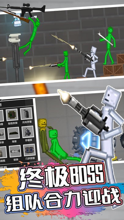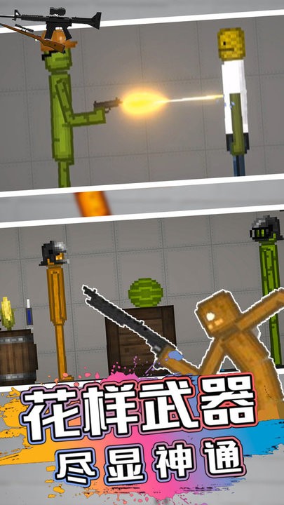 1. 武器系统:游戏包含热武器(手枪、散弹枪、步枪)与冷兵器(剑、长矛),玩家可将武器拖拽至角色手中直接使用,或通过编辑器自定义弹药类型(如水下、隐形、酸性)。