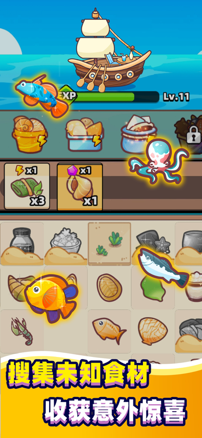 1. 双线并行的核心玩法:游戏将“海洋探索”与“寿司经营”深度结合,玩家白天需出海捕捞、探索沉船遗迹挖掘宝藏,夜晚则返回寿司店处理订单,通过食材合成解锁新配方,形成“资源获取-生产加工-销售反馈”的完整循环。例如,玩家可能通过深海捕捞获得稀有发光水母,将其制作成高价值寿司后,可吸引更多顾客并提升店铺评分。