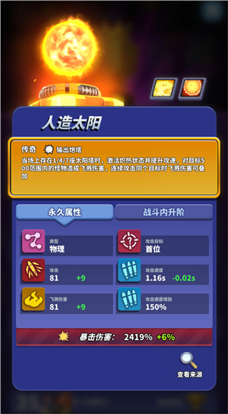 人造太阳拥有非常强力的溅射伤害并且伤害可以叠加,当防御塔数量达到 1|4|7 时便可激活溅射和增加攻速,配合反应堆的加持 BUFF 和重构的增伤 BUFF,输出能力非常强。