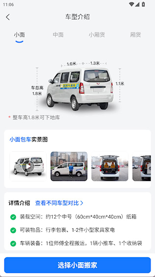 提供各车型的视频介绍,帮助用户直观了解载货空间与适用场景,避免因选错车型影响搬家效率。
