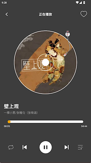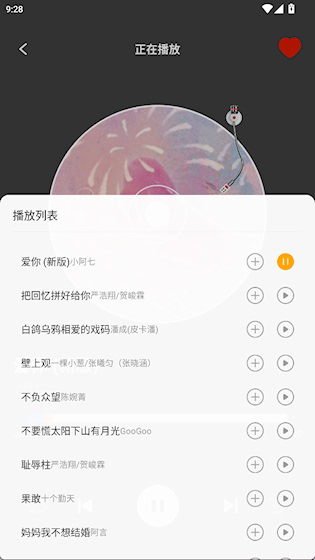2、播放界面提供模式切换、收藏歌曲等功能