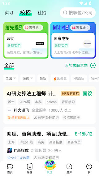 1、下载安装后,点击【职位】,左上角有实习、校招、社招三种选择