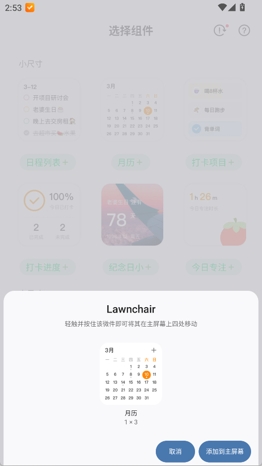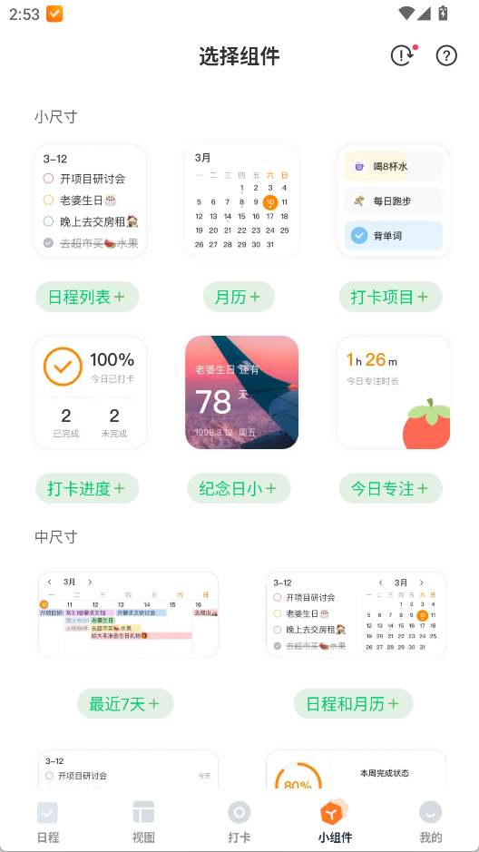 提供 2×2、4×2 等多种尺寸桌面小组件,颜色、透明度、显示字段皆可自定义;无需开 App 即可打卡、查看今日待办或倒数日。