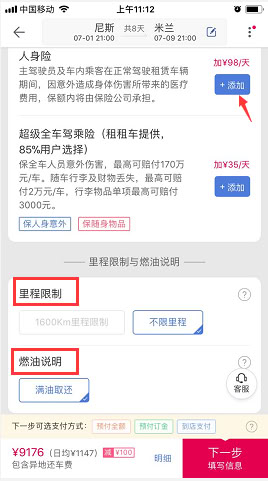 3、 在搜索页面选择喜欢的套餐,进入套餐详情页,查看车辆和套餐详情、条款等。如需额外购买保险或选择门店额外服务,可分别点击“添加”或“+”数量。