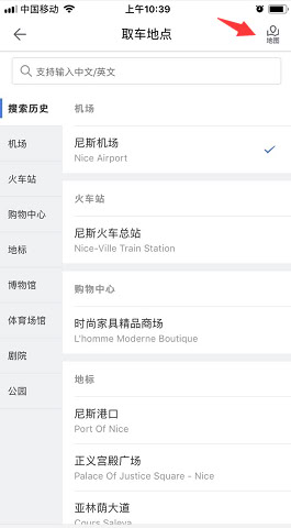 - 点击取/还车城市或地点,进入选择页面。取还车地点页面右侧有地图模式,可点击进入并输入地址进行搜索。