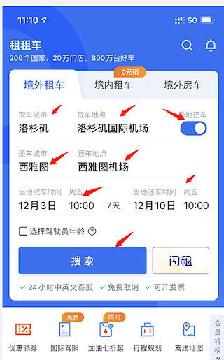 1、 打开APP并点击首页的【境外租车】,输入取还车的时间和地点。