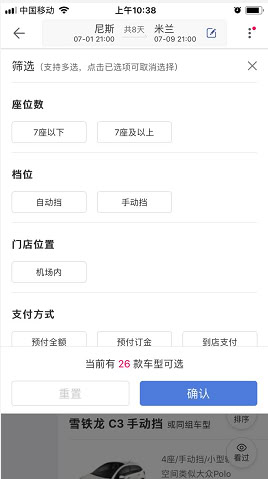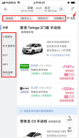 2、 进入搜索列表页后,可选择【自动挡】【7座及以上】【到店支付】【立即确认】等选项,也可点击右上方的“筛选”进入更多分类页面,或在左侧选择所需车型。