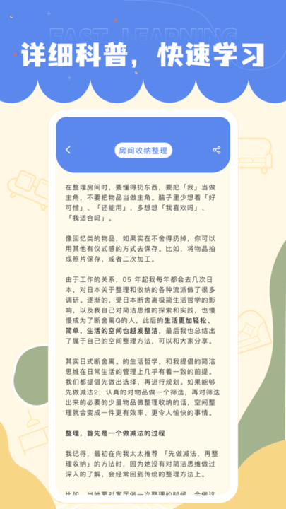 过年了,家家都要大扫除,不要的东西全部整理出来,房屋各个角落都要打扫清洁一遍。这个时候就会发现,东西是真的多啊。小小收纳app是家庭必备的收纳神器,用户可以在里面学习收纳技巧,学会断舍离。用户可以按照软件提供的模板去分类收纳东西,将摆放的杂乱无章的物品整理好。