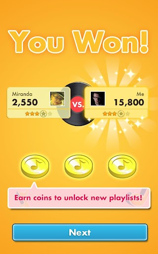 你可以邀请朋友或者任意对手快速回答有关歌手或者歌曲的多项选择题,你需要从一系列音乐流派或者播放清单中选择歌曲,每轮将会播放5首歌曲,你必须回答歌是谁唱的,歌曲名是什么,你回答的越快并且正确,得分越多,游戏会追踪你的胜负情况,如果你胜出,就会赢得3个硬币,如果输了就只有一个硬币,有了这些硬币,游戏就更好玩儿,就有更多歌曲供你选择,去猜测。轮到对手猜的时候,他们就会试图在速度或者数量上都胜过你,加入了挑战与竞争元素,没有广告!