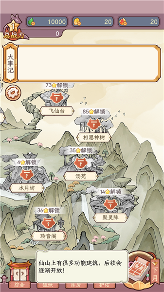3、游戏分为仙界和人界两个区域,随着等级以及剧情的推进可以解锁各个区域更多的功能;