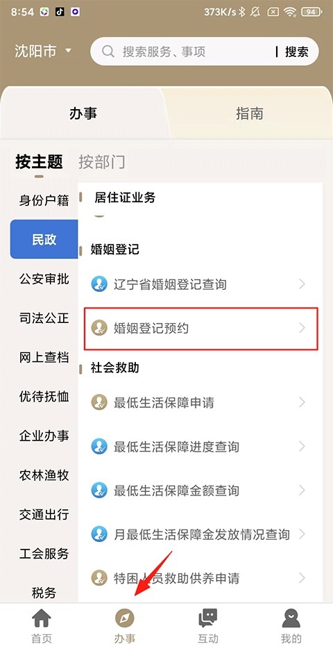 1、打开辽事通APP,在界面中依次点击【办事】-【民政】-【婚姻登记预约】选项;