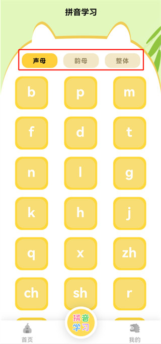 2、根据实际学习需求,在声母、韵母和整体认读音节中选择对应内容学习。