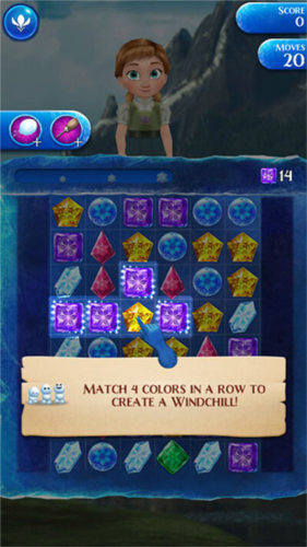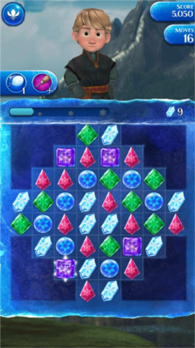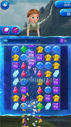 4、专属角色技能系统:每个登场角色都配备独一无二的升级技能,例如安娜的 “火焰消除” 可直接烧尽一整排冰晶,艾莎的 “冰雪粉碎” 能瞬间清除画面中所有同色冰晶,助力轻松突破难关。