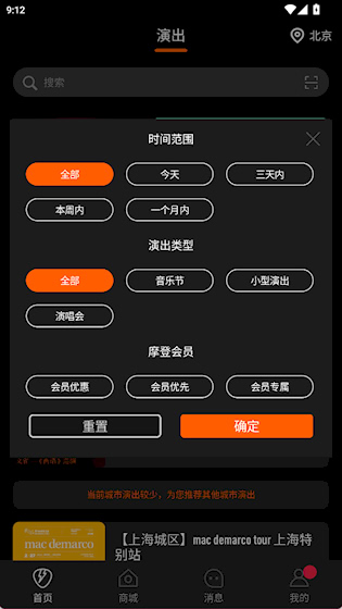 3、可以筛选时间范围和演出类型