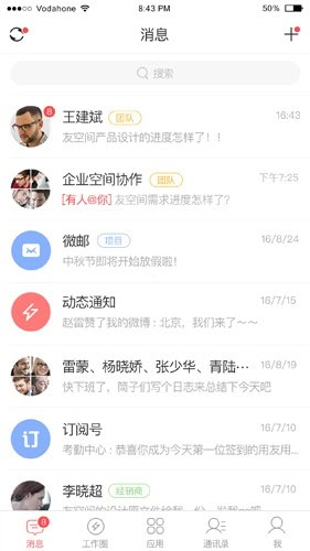5、资讯传播,企业文化快速落地:实时发布企业新闻、通知、公告,传导企业精神、传达规章制度。内部订阅号,让每个团队都是自媒体,自如展现团队建设、员工风采,活跃企业氛围。企业文档共享、知识积累,组织、团队、个人间文档共享,打造企业知识分享和创新环境。
