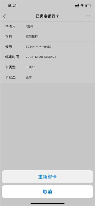 4、在弹出的菜单中,选择“重新绑卡”选项;