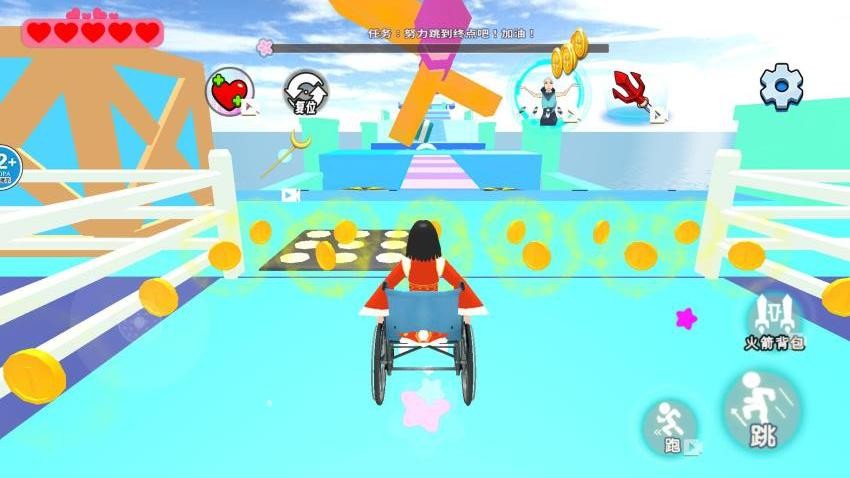 1. 核心玩法循环:玩家通过跑酷收集金币与材料,用于升级轮椅(移动速度、跳跃高度)或解锁新服饰,强化后的装备可反向提升关卡效率,形成“探索-养成-再探索”的正向循环。