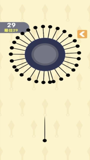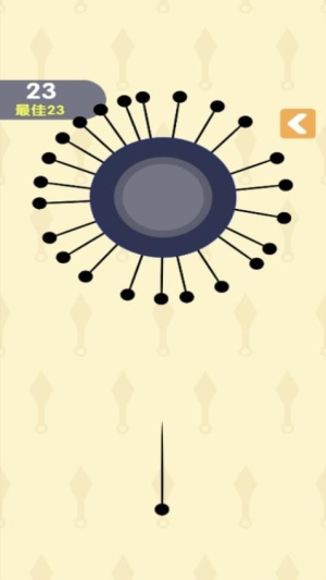 1. 核心规则:每局开始时,圆盘上预置3根系统针,玩家需将手中全部飞针插入未被占据的缝隙。插入后飞针随圆盘旋转,若新插入针触碰已有针则游戏结束。