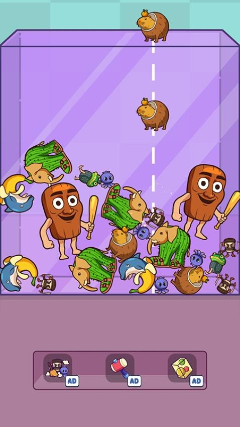1. 基础合成规则:点击屏幕将怪物投入箱子,相同怪物碰撞后自动合成更高级形态(如“木棍人+木棍人=喵咪鱼”),合成大型怪物可触发50-100金币奖励,用于解锁新角色或购买道具。