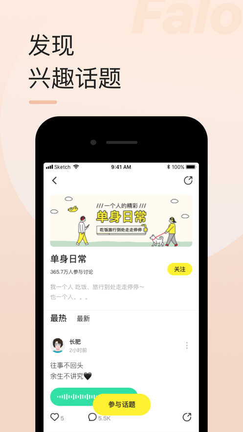 falo是一款专为年轻人设计的社交软件,旨在通过兴趣匹配和实名认证,为用户提供一个安全、有趣且高效的交友平台。它以“与美好不期而遇”为slogan,鼓励用户在快节奏的现代生活中慢下来,发现身边的小美好,并通过线上互动逐渐发展为线下的真实社交关系。