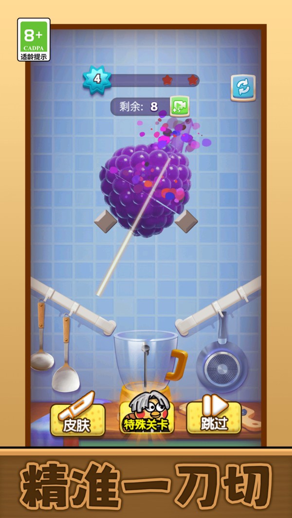 2. 善用道具组合:激光刀可穿透多层水果实现高效切割,旋风刃则适合应对密集排列的果物群,合理切换工具能大幅提升通关效率。