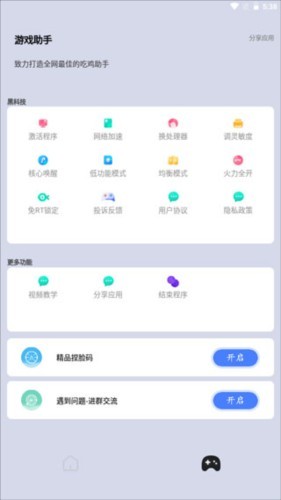 3、进入游戏助手后,可看到多种辅助功能,涵盖更换处理器、调节灵敏度等实用操作。